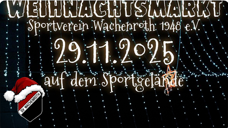 Weihnachtsmarkt am 29. November 2025 auf dem Sportgelände des SV Wachenroth Programm: 18.00 Uhr: Christkind 18.30 Uhr Feuerwerk 19.00 Uhr